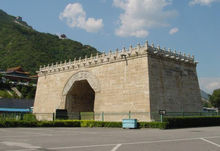 居庸关长城元代时,居庸关是大都(北京)通往上都(今内蒙多伦)的重要交通大道。因皇帝经常过往,因而,在关内设有行宫、寺院、花园等建筑。现存的云台就是元代修建的过街塔台基,当初上面建有三座喇嘛塔,元末明初时被毁。明正统四年(1439年)在上面重修佛殿,名泰安寺,寺于康熙年间焚毁,此后只剩云台保留至今。其券洞上雕刻的佛教图像和梵、藏、西夏、维、八思巴、汉等六种文字的经文有学术价值,是研究元代佛教、古代文字和各民族间文化交流史的重要史料,是现存元代雕刻艺术的精美杰作。[2]